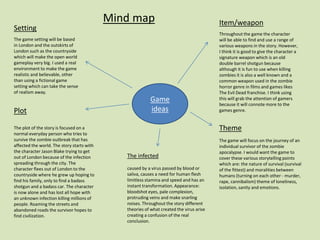 The document outlines ideas for a first-person zombie apocalypse survival horror game set in a post-apocalyptic open world version of London. The protagonist is Jason Blake, a 27-year old working class man who must scavenge for weapons and supplies while interacting with other survivors. Gameplay will involve exploring the open world map to complete missions and level up skills like weapon usage and stamina. Choices will determine whether the character becomes more heroic or renegade over the course of the story. Mood boards showcase the gritty, desolate atmosphere and include images of weapons, vehicles, and the infected to bring the game vision to life.