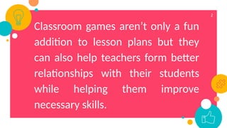 Classroom games serve as an effective teaching strategy that enhances student relationships and learning by accommodating various learning styles. They promote creative expression, teamwork, and a comfortable learning environment while also providing benefits like helping students adjust to school and encouraging interaction. However, potential disadvantages include distractions, conflicts during competitive games, and the need for relevance to educational content.