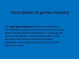 The video game industry is the economic sector involved with developing, marketing, and selling video games. It employs thousands of people worldwide in dozens of job disciplines. Some examples of large video game companies include Overflow in Japan, Accolade in California, Adventure Soft in England, and Anino Games in the Philippines. These companies may be owned by or have other media interests through larger parent companies like Activision.