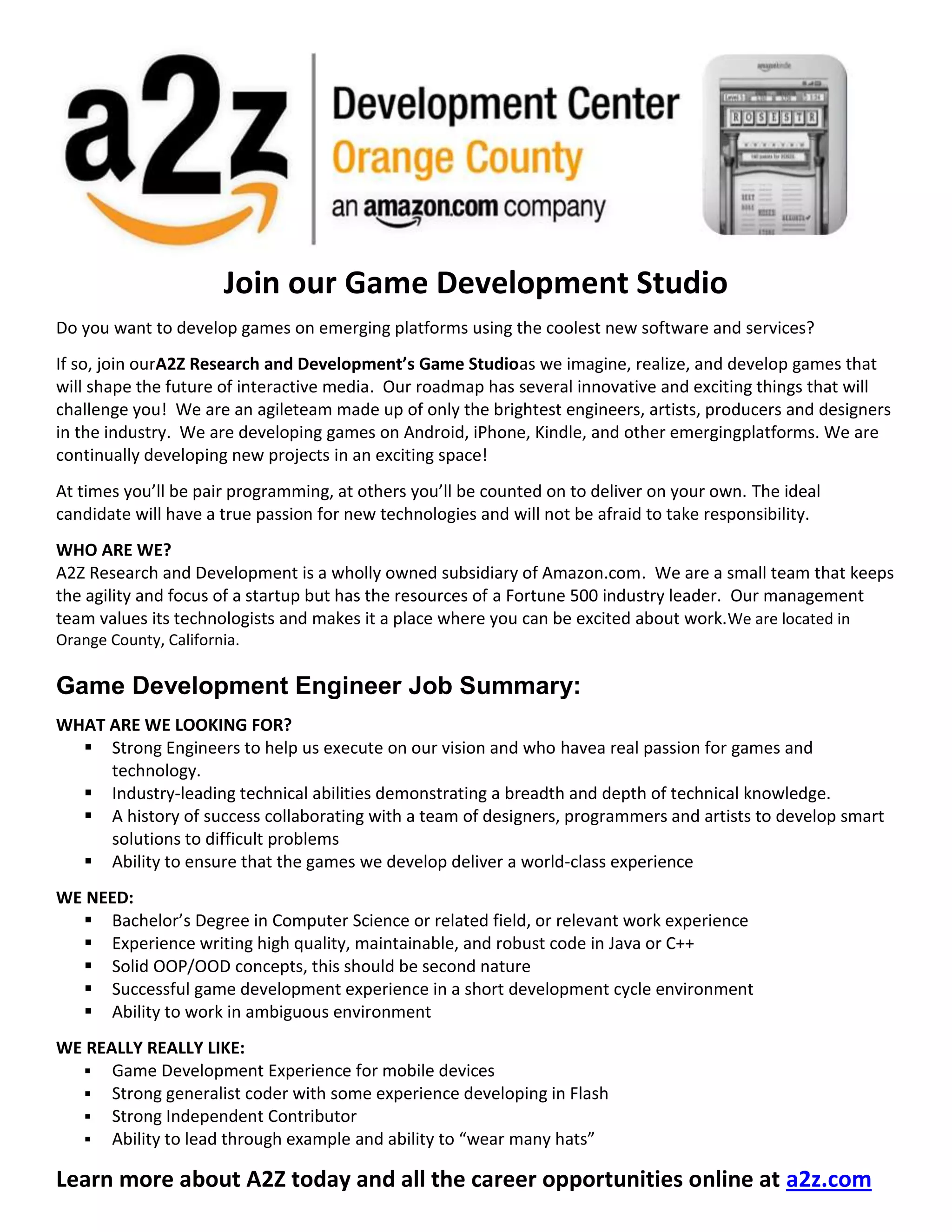 A2Z Research and Development is looking for strong engineers to join their game studio developing games for emerging platforms like Android, iPhone, and Kindle. The ideal candidate will have a passion for new technologies and games, experience writing code for game development, and the ability to collaborate in an agile environment. A2Z is a subsidiary of Amazon that values its technologists and offers the resources of a large company with the agility of a startup.