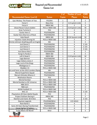 This document lists required and recommended games for a mobile gaming service. It provides details on over 100 games across multiple consoles, including the number of copies, number of local players, console, and ESRB rating. The games cover a wide variety of genres including shooters, sports, fighting, racing, and party games. Major franchises include Call of Duty, Halo, Gears of War, FIFA, Mario, Zelda and more. The goal is to have a large catalog of games that will appeal to different ages and interests.
