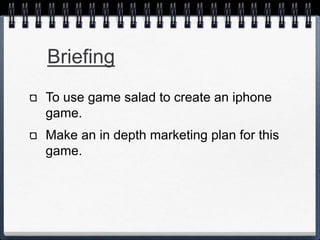 The document outlines a marketing plan for a mobile game called "Alien Controller" aimed at children ages 9-12. The plan includes: