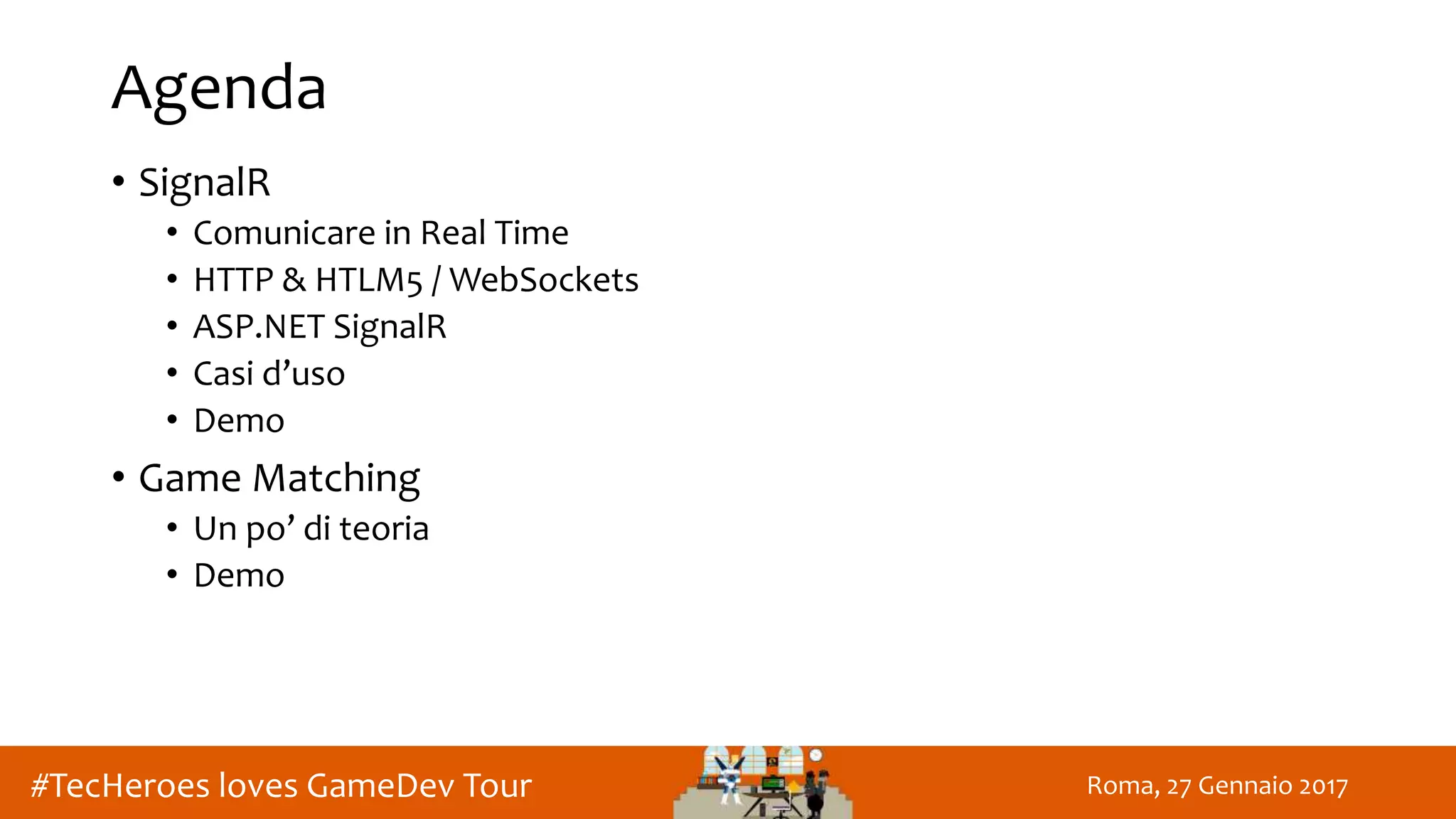 Il documento presenta un tour dedicato allo sviluppo di giochi utilizzando SignalR, una libreria ASP.NET per la comunicazione in tempo reale. Viene discussa la comunicazione full duplex, le limitazioni dei metodi di polling e l'importanza di SignalR per facilitare l'implementazione di funzionalità real-time. Inoltre, si accenna a nuove versioni e servizi, come il multiplayer di Unity, per supportare il matching di giochi.