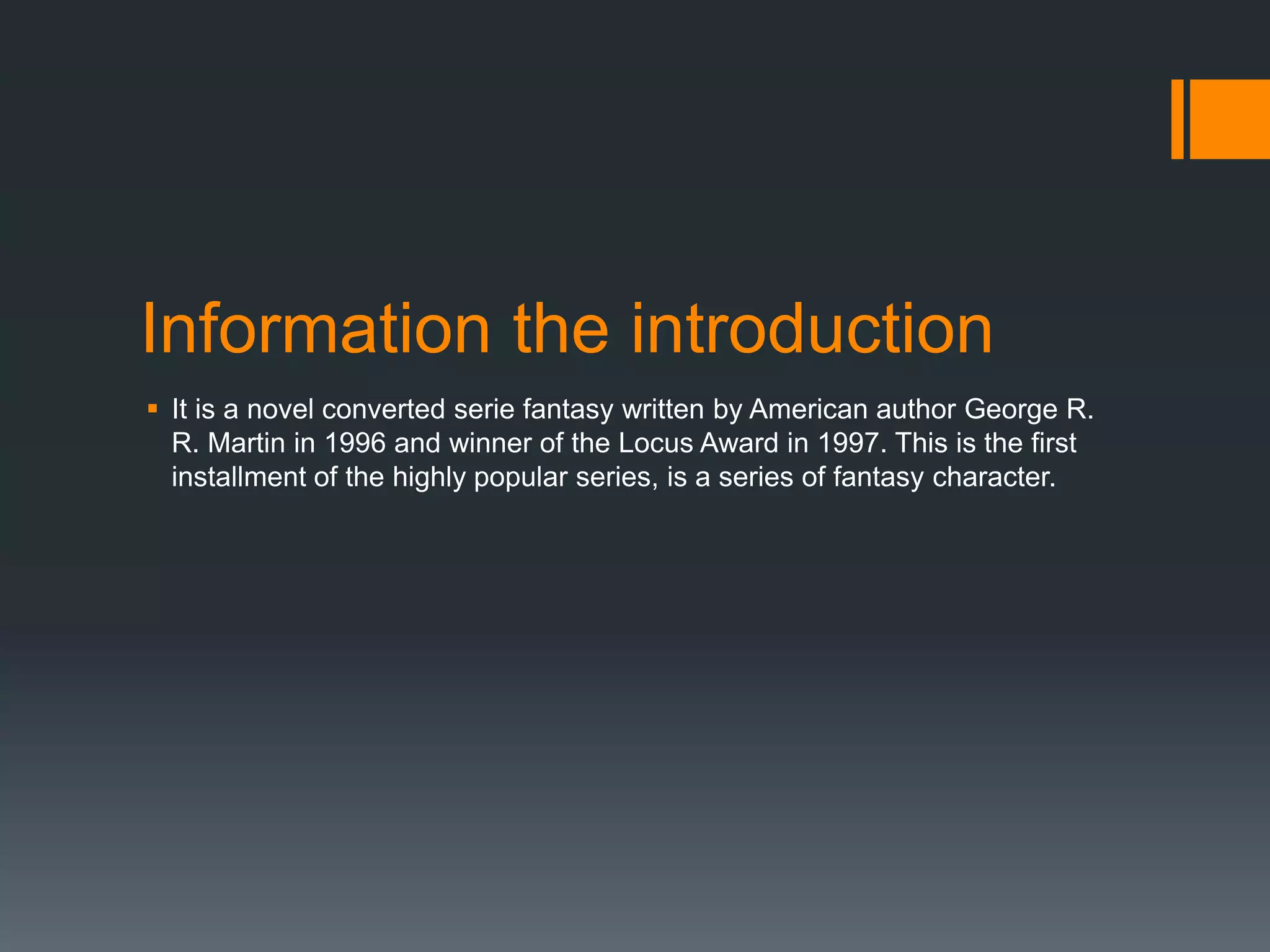 Game of Thrones is a fantasy novel by George R.R. Martin published in 1996 that won the Locus Award. It was later adapted into a popular TV series. The story follows three main plotlines simultaneously: the civil war among noble families for control of the Seven Kingdoms; events on the Wall where the Night's Watch guards against threats from beyond; and Daenerys Targaryen's exile in Pentos as she aims to claim the Iron Throne. The story features several point-of-view characters including members of the Stark and Lannister families. The novel and TV series were both critically and commercially successful, receiving numerous awards and nominations.