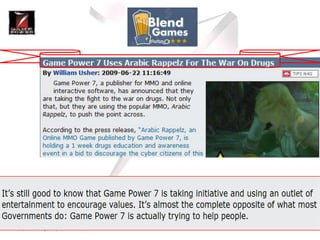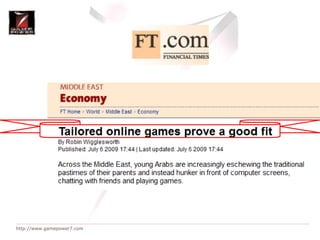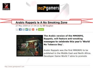 This document provides information about Weiss Investment Media and their online gaming division Game Power 7. It outlines their mission to create online games that respect regional values and principles. It then gives an overview of Game Power 7's history, industries, published games including Arabic Rappelz, World of Secrets and X-Kick. Details are provided on the games' features and statuses. The document also discusses how Game Power 7 localizes games for different cultures by adapting stories, characters and more.