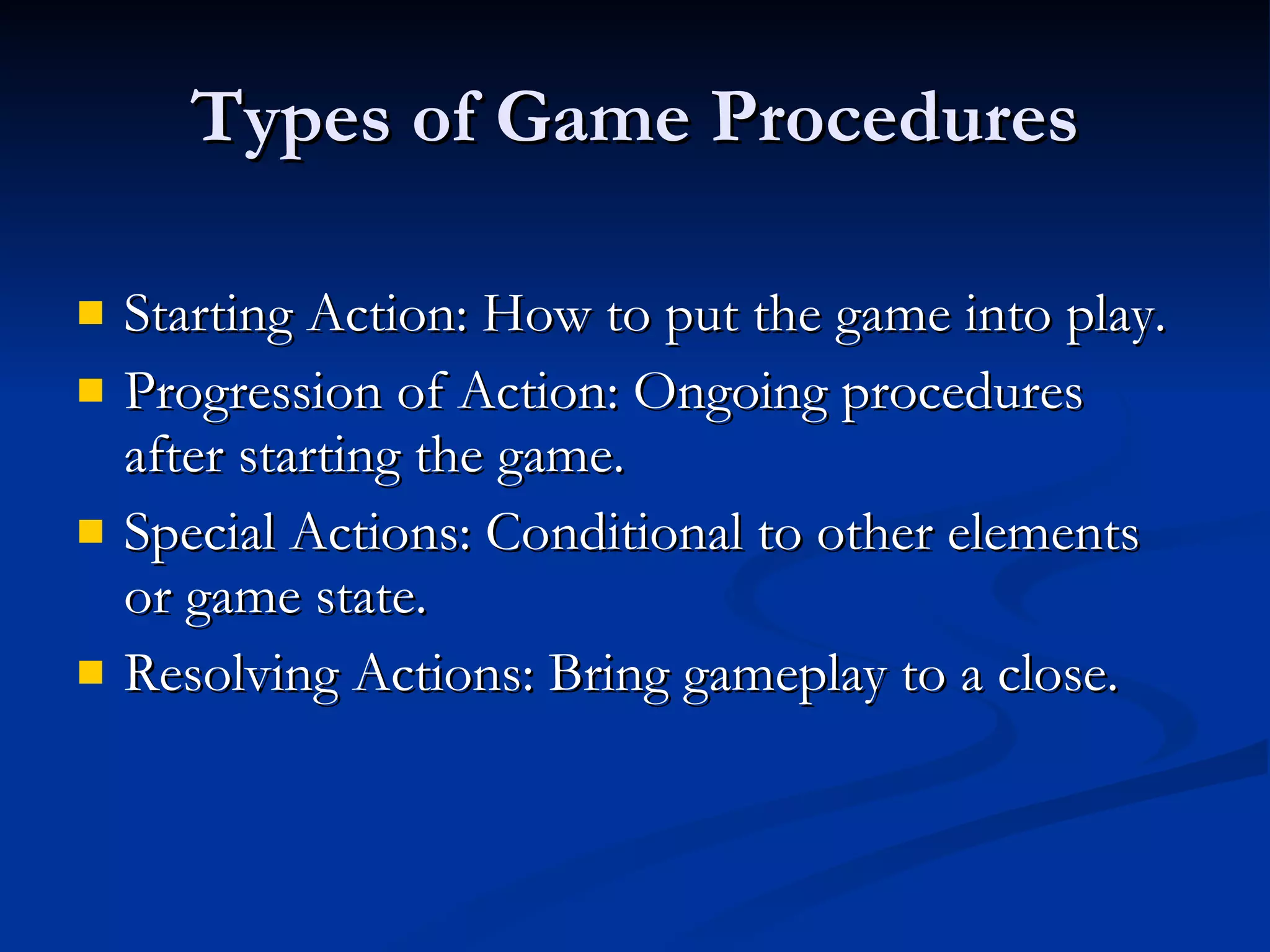 The document discusses different types of game procedures including starting actions, progression of actions, special actions, and resolving actions. It provides examples of procedures for the games Connect Four and Super Mario Brothers. Game procedures in digital games can be more complex than non-digital games as they are calculated by the program rather than the players. When defining procedures, designers must consider limitations of the playing environment.