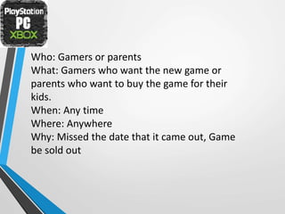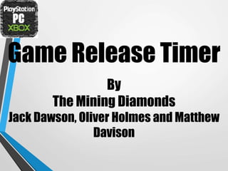 The document describes a new app developed by a team called the Mining Diamonds, designed to help gamers and parents track the release dates of upcoming video games. The app features a wish list, price comparisons, and intends to gather information from game makers and retailers to provide accurate data. By making the app free and incorporating ads and in-app purchases, the team aims to sustain its operations while competing effectively in the market.