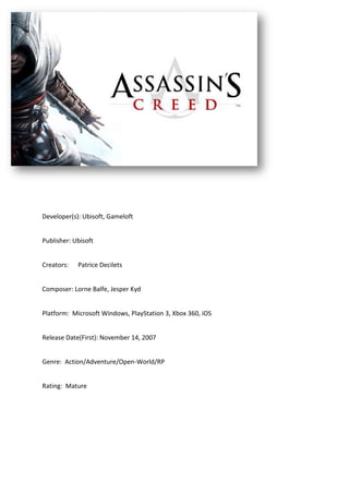 1) The document analyzes two role-playing games, Assassin's Creed and Elder Scrolls V: Skyrim, discussing their settings, characters, and gameplay.