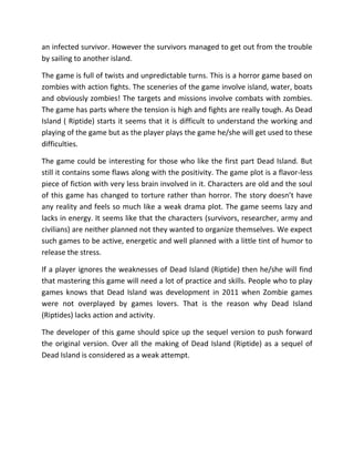 Dead Island (Riptide) is a sequel to the 2011 horror role-playing game Dead Island, released in 2012 by Techland and Koch Media. The story follows survivors who escape to an island while facing a zombie infection linked to chemical weapons, but critiques highlight the game's weak plot, lack of planning in character development, and overall laziness. Although it could appeal to fans of the original, the game is seen as a flawed sequel that failed to improve upon its predecessor.