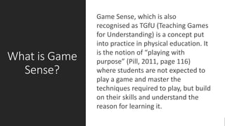 Game Sense, also known as TGfU (Teaching Games for Understanding), is a student-centered approach to physical education that focuses on learning through game play rather than techniques. It encourages students to connect their skills to game requirements. Game Sense considers individual student attributes and allows them to use problem-solving skills during games. It progresses learning from basic movement knowledge to complex decision making, with the student rather than teacher as the main decision maker. Benefits include increased participation, motivation, and tailoring for diverse abilities.