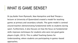 Game sense is a model for teaching games created by Dr Joy Butler and Rod Thorpe that focuses on fundamental skills within the context of the full game. It is called Teaching Games for Understanding (TGFU), where students learn skills through participation in modified games rather than isolated drills. TGFU has four pedagogical principles: sampling, representation, exaggeration, and tactical complexity. Game sense allows students to understand a game's concepts and tactics during play rather than just its rules. It has been successful in engaging students and helping them learn.