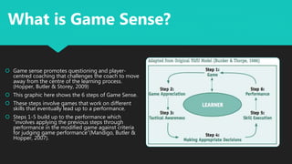 Game Sense is an approach to coaching that focuses on player-centered learning. It involves 6 steps that build fundamental movement skills through modified games leading up to a performance. The goals are to develop decision making skills and transfer skills learned to different physical activities and sports. Fundamental movement skills like balance, jumping, throwing, and kicking are important for developing lifelong commitment to physical activity. They are taught within game-like situations through the Game Sense approach.