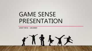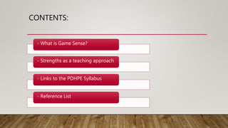 The document discusses Game Sense, which is a student-centered teaching approach used in physical education. Game Sense allows students to develop skills within a game setting by modifying activities to suit different ability levels. It focuses on learning techniques through playing games first before focusing on mechanics. Game Sense is beneficial as it encourages cooperative learning, develops cognitive skills, and aligns with outcomes in the NSW PDHPE Syllabus such as participating in sports and understanding the health impacts of physical activity.