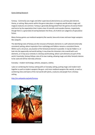 Fantasy settings commonly involve magic and supernatural elements. Many fantasy games use medieval weapons like swords and bows. Fantasy follows its own internally consistent rules allowing magic alongside other fantastic devices. The document discusses combining fantasy and everyday modern settings, involving both magic and modern technology as well as medieval and modern weapons in an integrated world. Devil May Cry is cited as an example blending the real world with a dark fantasy setting ruled by demons.