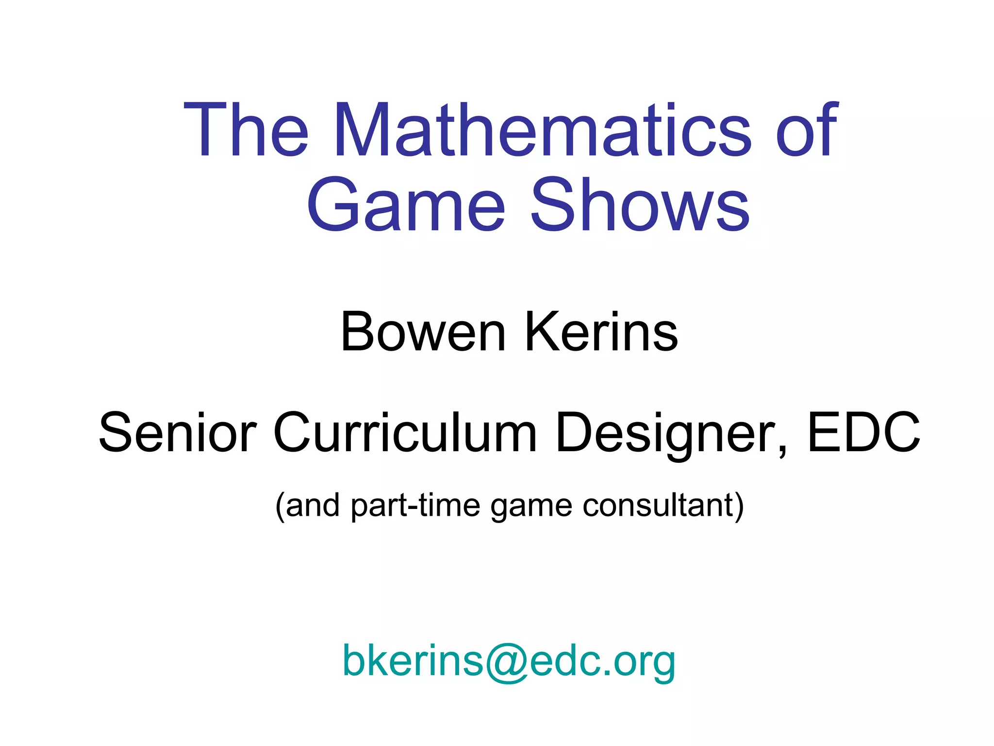 1. Game shows involve complex mathematical problems for both contestants and producers. Contestants must strategize their gameplay while producers aim to build entertaining yet profitable games.