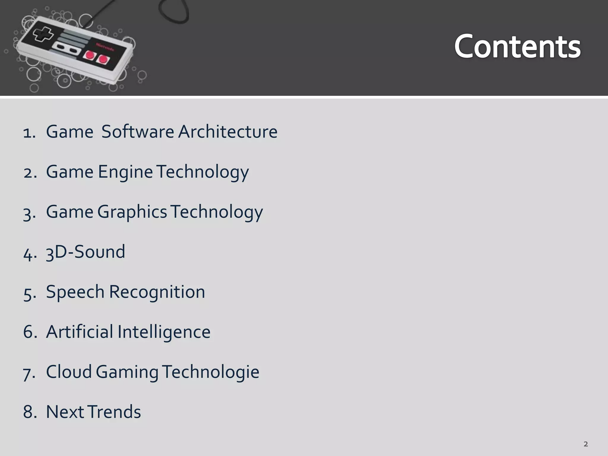 The document discusses various topics related to game software architecture and technology. It covers game engines, graphics technology, 3D sound, speech recognition, artificial intelligence, cloud gaming, and trends. Specific technologies mentioned include DirectX, OpenGL, physics engines, rendering engines, and audio engines. Game development tools like Unity3D and programming languages for games are also summarized.