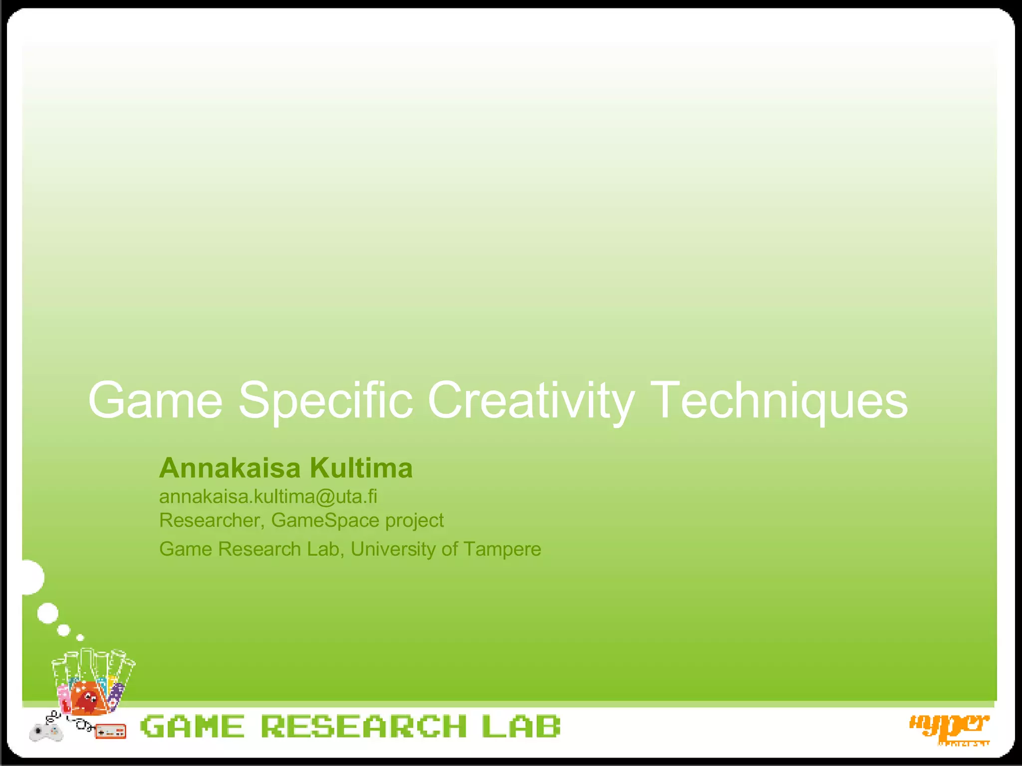The document discusses creativity techniques specific to game design, emphasizing structured idea generation processes rather than random individual traits. It highlights the importance of diverse environments and structured methods to enhance creative output while critiquing traditional brainstorming approaches that often yield little success. Additionally, it details various experimental techniques and workshops aimed at developing casual mobile multiplayer game concepts, showcasing observations from these sessions to refine ideation methods.