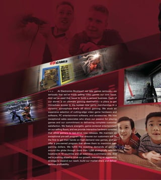 This document is the annual report for Electronics Boutique Holdings Corp for fiscal year 2003. It summarizes the company's financial performance for the year, including record total revenues of $1.316 billion, record net income of $32.6 million, and comparable store sales growth of 8.3%. It highlights how the company focused exclusively on interactive entertainment, launched a rebranding under the EB Games name, and expanded its pre-owned software business to drive margin growth. The company leveraged these strategic moves to gain market share and deliver strong financial results despite heightened retail competition.