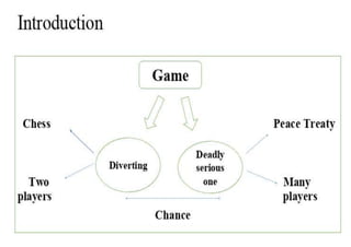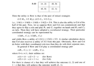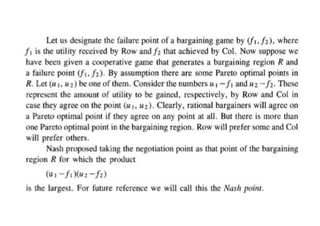 The document discusses game theory, focusing on non-zero-sum games where players' interests can overlap, emphasizing the complexity of cooperation without communication, exemplified by the prisoner's dilemma. It explores cooperative games where players may achieve better outcomes through coordination, highlighting the concept of Pareto optimal points and the challenges in identifying fair solutions. The text transitions to bargaining games, introducing Nash's solution as a guaranteed Pareto optimal point within the bargaining region.