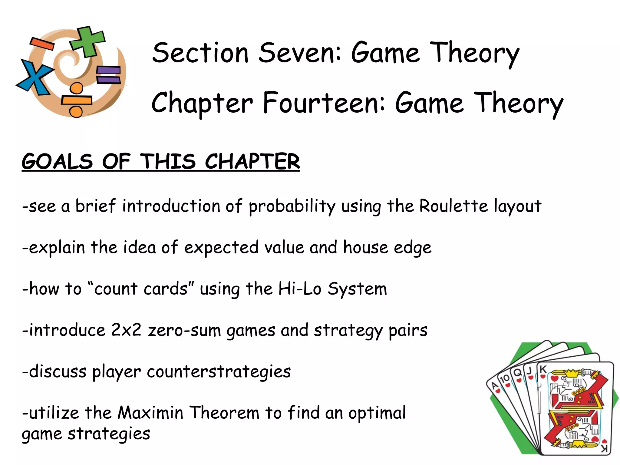The document discusses game theory concepts like probability, expected value, and strategies for 2x2 zero-sum games. It introduces roulette as a probability experiment and defines related terms. Expected value is explained using roulette bets, showing the "house edge" gives casinos an advantage. Card counting strategies for blackjack are outlined to shift the edge to the player. Optimal strategies like counterstrategies and the maximin theorem are presented for 2x2 zero-sum games.