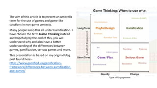 The document discusses the concept of 'game thinking,' a term used to differentiate between games, serious games, and gamification. It outlines five core categories of game thinking: game-inspired design, gamification, simulation, serious games, and traditional games, with each category focused on distinct design considerations. The article emphasizes the application of game elements to solve problems and enhance user experiences across various contexts, providing a framework for designers to create engaging solutions.