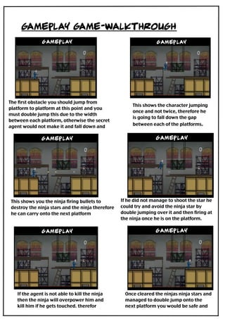 Agent Slick navigates platforms, avoiding ninja stars and defeating ninjas. He can double jump between platforms and shoot bullets to destroy projectiles and enemies. Ninjas spawn on platforms and throw stars, killing the agent on contact. Scoring points by eliminating ninjas, the goal is to navigate obstacles without dying and losing points.