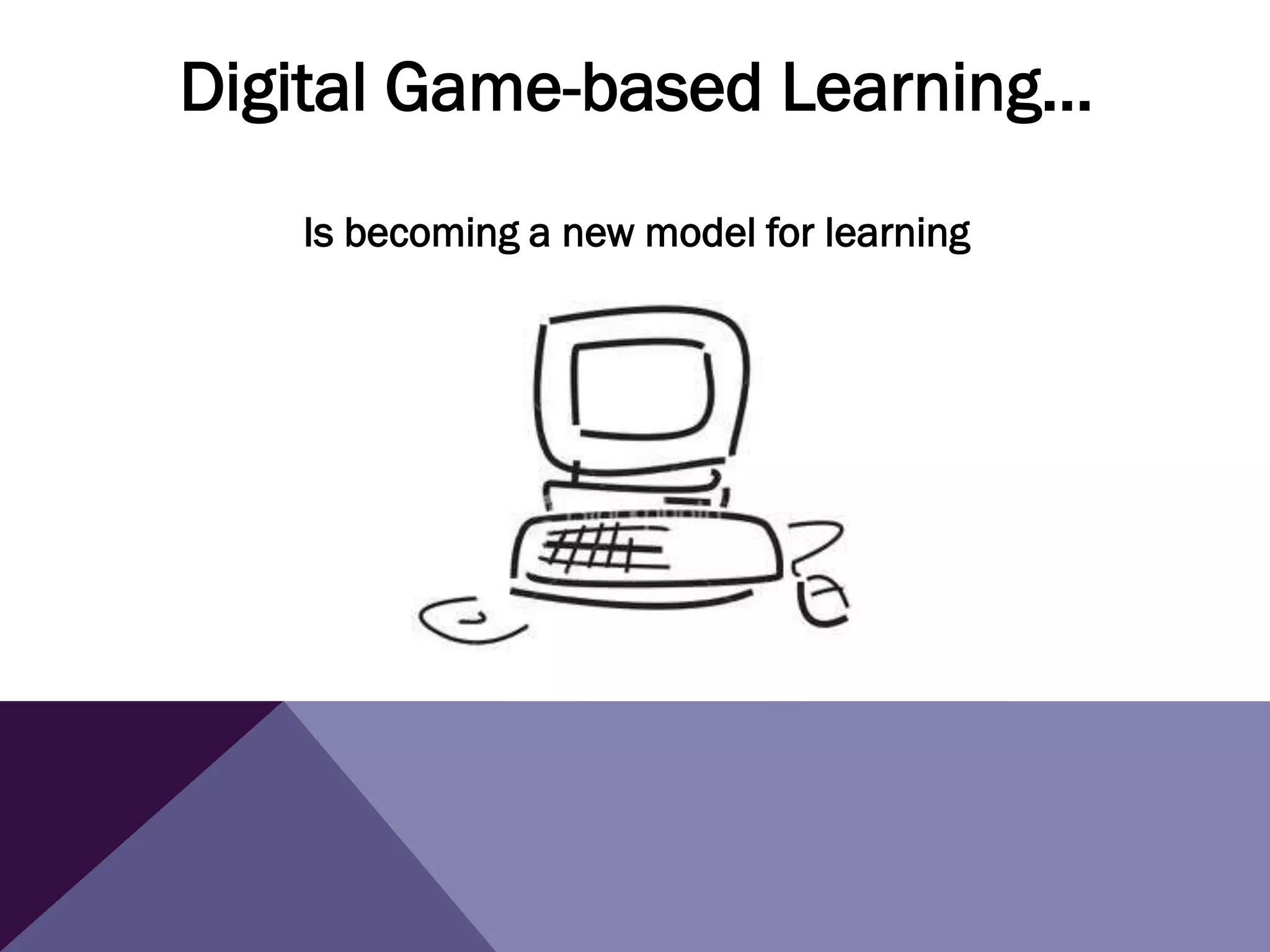 This document discusses digital game-based learning and its growing popularity as a new model for education. It identifies different types of digital game-based learning like edutainment, training simulators, and serious games. It also outlines who uses game-based learning, such as Fortune 500 companies and therapists. The document then explains how games can help students socially and cognitively by developing their critical thinking skills. It discusses key elements of games like challenge, feedback, and triggering curiosity. Finally, it notes why game-based learning is effective for topics like reading, math, and building knowledge, and identifies remaining questions about implementing games into classrooms.