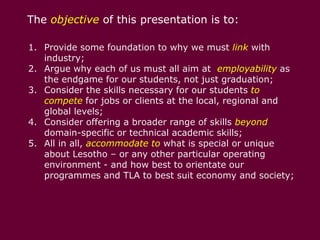 This document discusses linking university education with industry to improve student employability. It argues that universities should aim to provide both technical skills and "employability skills" demanded by the job market. Examples of employability skills include communication, teamwork, problem-solving, and self-management. The document also stresses the importance of offering a broad range of skills beyond just academic or technical skills, in order to prepare students for a changing job market. It advocates designing programs and teaching methods to best suit the needs of the local economy and society.