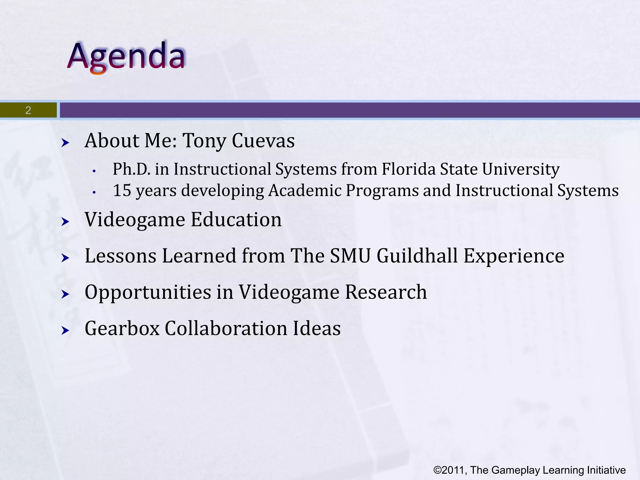 Tony Cuevas discusses the growth of video game education, highlighting the need for formal training to meet industry demands. The SMU Guildhall program has evolved since 2002, producing over 350 graduates and focusing on interdisciplinary collaboration, research, and practical portfolio development. The document outlines current research opportunities in video games, academic programs, and partnerships that address technological and educational challenges within the industry.