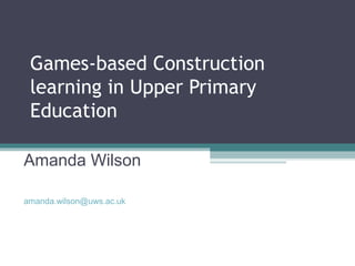- The document discusses using games-based construction learning in upper primary education. It provides background on the author and introduces programming tools for children like Scratch.