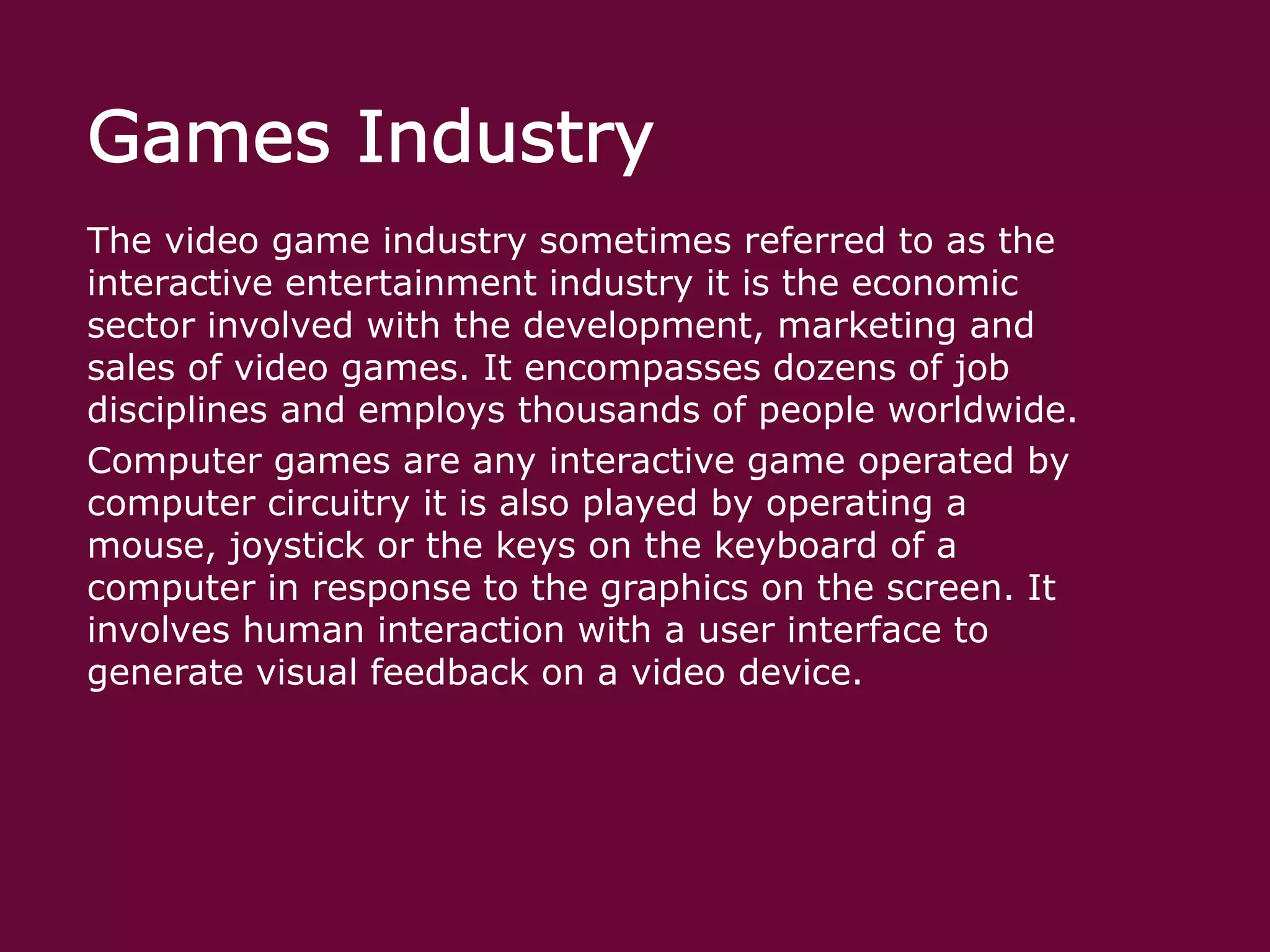 The video game industry develops, markets, and sells interactive video games and employs thousands worldwide. It encompasses many job disciplines. Computer games are played by interacting with a computer interface using a mouse, joystick, or keyboard in response to on-screen graphics, generating visual feedback. The US video game industry took in $9.5 billion in 2007, $11.7 billion in 2008, and $25.1 billion in 2010, and the UK industry employs 7,000 people and is Europe's largest market.
