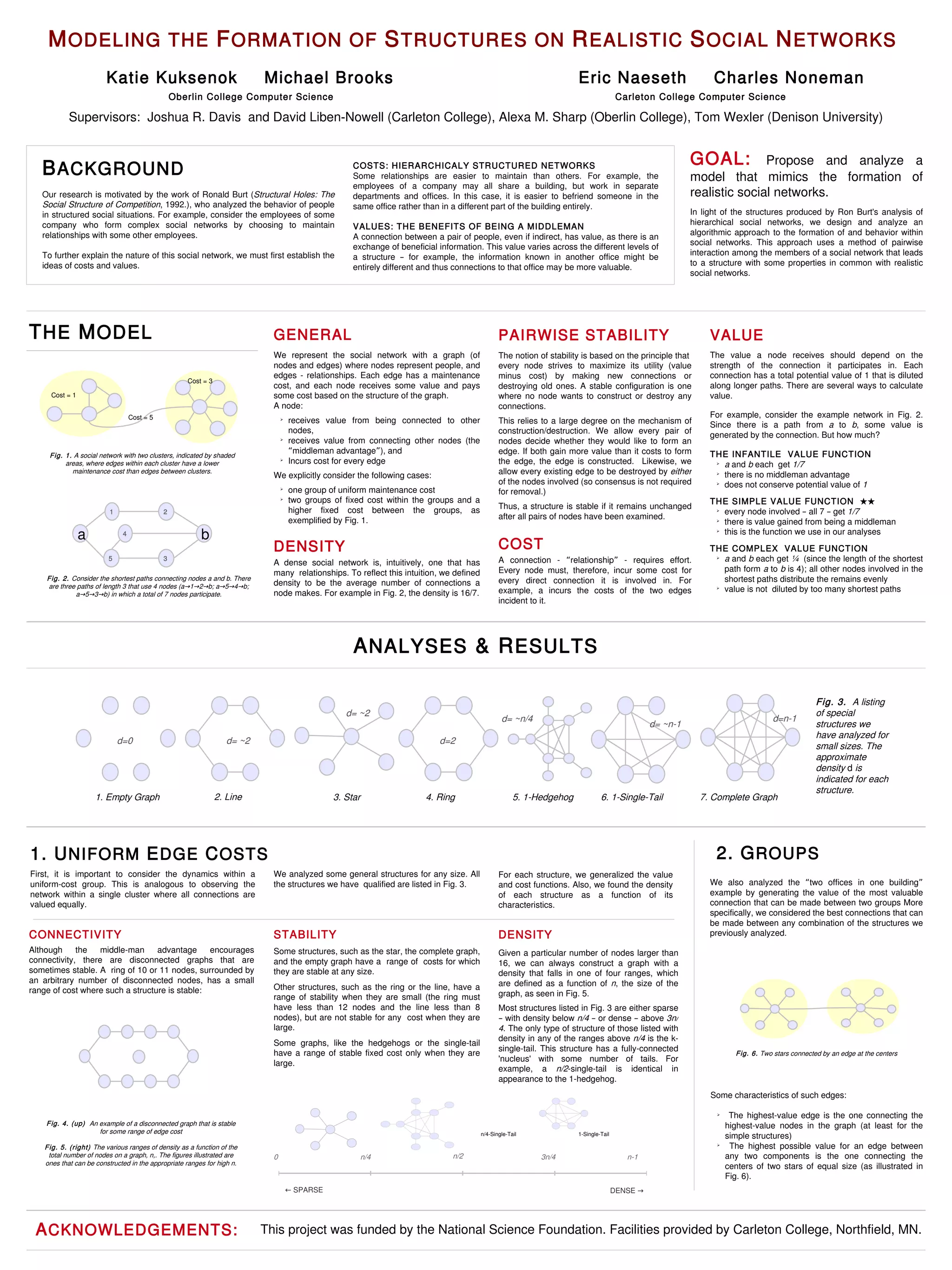 3. The authors analyze uniform cost structures, the effects of groups with different costs, and the properties of stable structures like density and connectivity. They find the highest value connections tend to connect