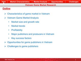 This document analyzes the Vietnam game market. It finds that the market size was $243 million in 2013, is forecast to grow 50-70% by 2017, and is dominated by mobile games. Role playing games are most popular and profitable. The top publishers are VNG, Garena, VTC and FPT. Opportunities exist due to growing internet and smartphone use, while challenges include game cloning, licensing issues, and competition from China.