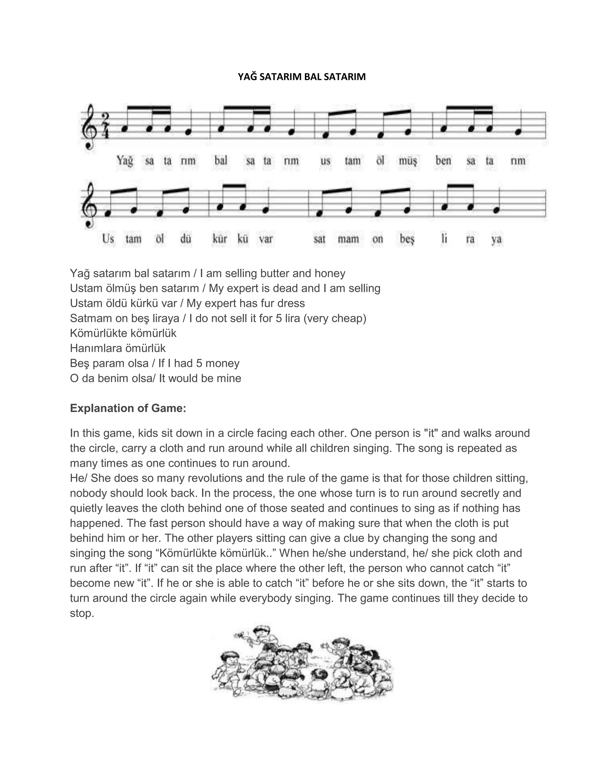 The first game involves children sitting in a circle while one child runs around the outside carrying a cloth. The running child secretly leaves the cloth behind one seated child while the others sing. When a clue is given in the song, the child with the cloth must try to catch the running child before they sit down in their place.