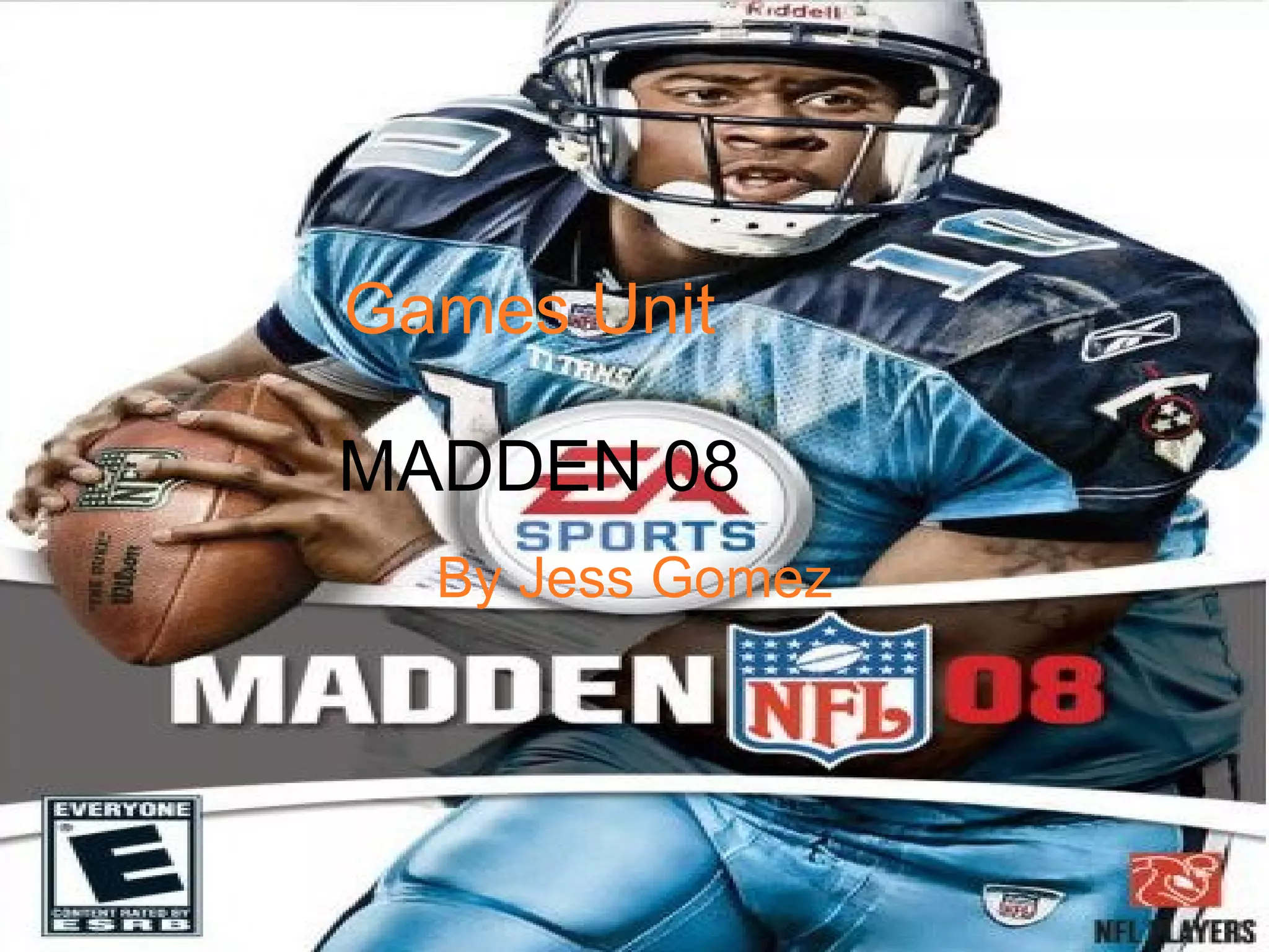 This document provides a detailed walkthrough and overview of the Madden 08 football video game. It describes the various menus, game modes, controls, and features. The summary covers the franchise mode gameplay, including drafting, the regular season, playoffs, and offseason activities. Play is advanced by playing weeks, and important steps like saving are noted. Player progression, injuries, and other stats/team information are also outlined. The walkthrough provides a comprehensive look at how to navigate and play all aspects of the Madden 08 game.