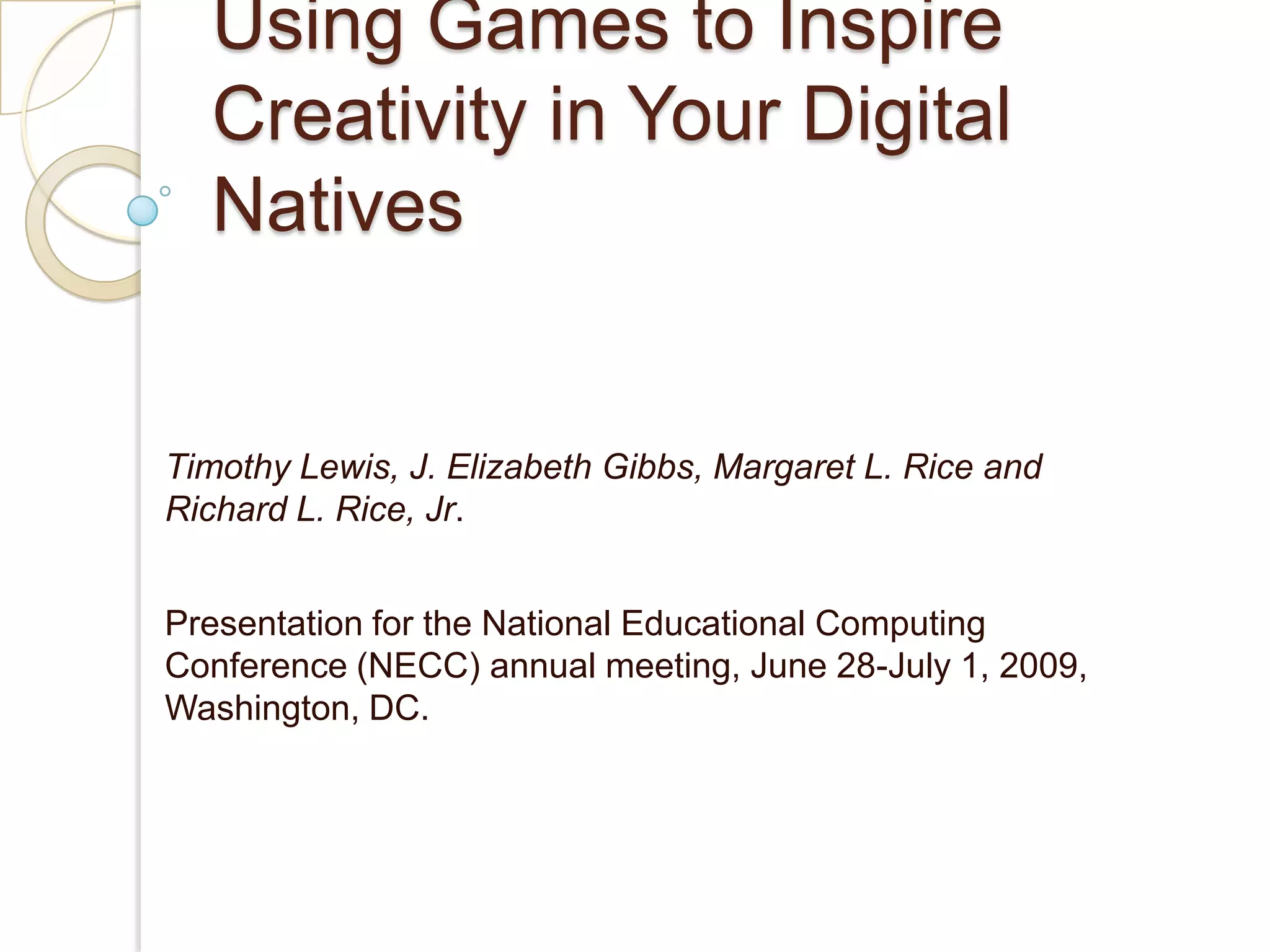 Using Games to Inspire Creativity in Your Digital Natives discusses how games can be used to motivate and engage today's students, known as "digital natives" who have grown up with technology. Research has shown that games can develop skills like strategic thinking, problem solving, and reasoning. Games require players to learn skills and concepts to advance, making them responsible for their own progress unlike other media. Different types of games are described like educational entertainment and simulations, along with examples of games for different ages and subjects. Benefits of educational games include fostering creativity, problem solving, and making learning fun.