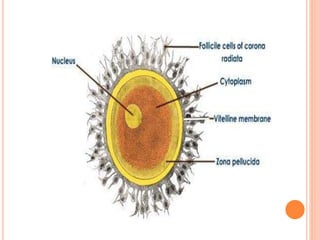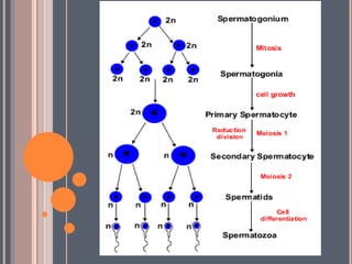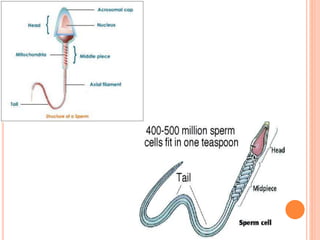 Gametogenesis is the process by which haploid gametes are formed from diploid germ cells in the gonads. There are two types: spermatogenesis and oogenesis. Spermatogenesis occurs in the testes and involves the formation of sperm from spermatogonia over 74 days, involving multiplication, growth, and maturation phases. Oogenesis occurs in the ovaries and also involves three phases to form ova from oogonia. The resulting gametes, sperm and ovum, differ in structure according to their roles in fertilization. Sperm are small, motile cells specialized for movement, while ovum are larger stationary cells specialized to receive sperm and support development.