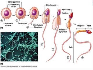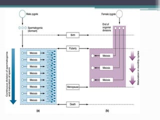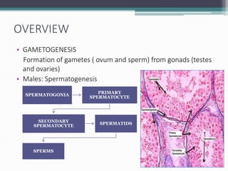 Gametogenesis is the process of forming gametes (eggs and sperm) from gonads through meiosis. In males, spermatogenesis occurs in the testes through spermatocytogenesis, meiosis I and II, and spermiogenesis. In females, oogenesis occurs in the ovaries through follicular development, ovulation, and the luteal phase. Infertility can result from problems with gametogenesis like inflammation of the testes or failure of the ovaries to ovulate, as well as issues with the fallopian tubes, cervix, or uterus.