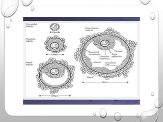 This document summarizes the processes of gametogenesis and ovulation. It discusses folliculogenesis, from primordial follicles to the pre-ovulatory development of the dominant follicle. The luteal phase and corpus luteum formation after ovulation is also described. Finally, it provides an overview of the hormonal regulation of the menstrual cycle by the hypothalamic-pituitary-ovarian axis, and the correlated endometrial changes through the proliferative, secretory and menstrual phases.
