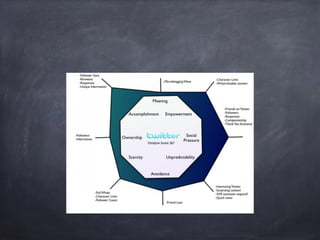 This document outlines the 8 core drivers of gamification according to Octalysis framework: 1) Epic Meaning and Purpose, 2) Development and Accomplishment, 3) Empowerment of Creativity and Feedback, 4) Ownership and Possession, 5) Social Influence and Relatedness, 6) Scarcity and Impatience, 7) Unpredictability and Curiosity, 8) Loss and Avoidance. Each driver is then broken down into specific techniques that can be used when designing gamified systems. The document concludes by recommending some foundational books on game design.