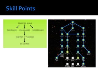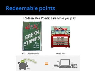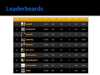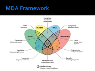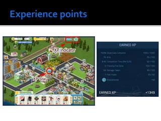 The document outlines approaches to gamification in various business contexts, highlighting the importance of intrinsic and extrinsic motivation. It details the steps to create an effective gamification framework, including defining objectives, understanding player behaviors, and utilizing metrics like experience points and leaderboards. Additionally, it emphasizes the role of fun and engagement in enhancing performance across disparate industries.