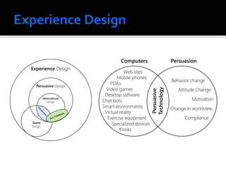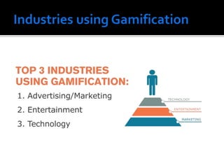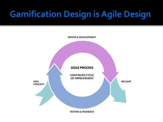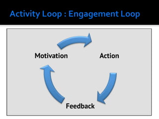 The document discusses gamification as a powerful tool that applies game design thinking and mechanics in non-game contexts to enhance engagement and interaction. It emphasizes the importance of user experience, providing immediate value, maintaining motivation, and creating a system that encourages positive reinforcement while carefully managing user choices. Additionally, it outlines common mistakes in gamification strategies and suggests focusing on long-term behavior and variable rewards for effective implementation.