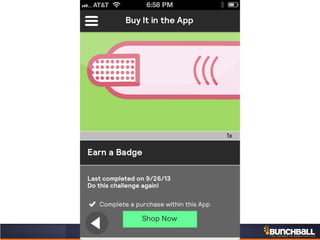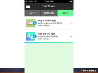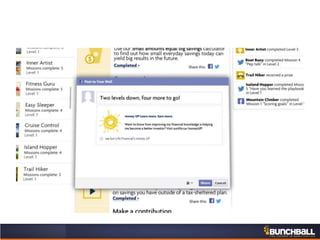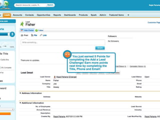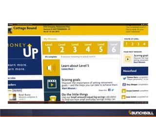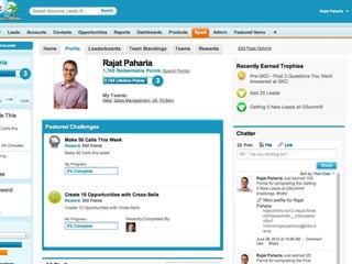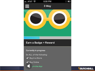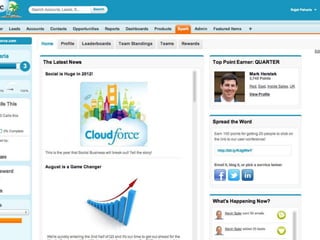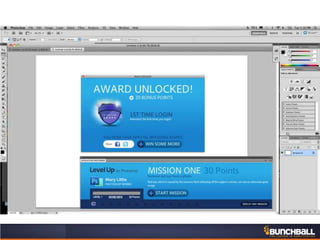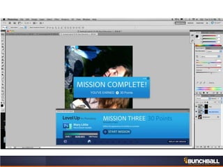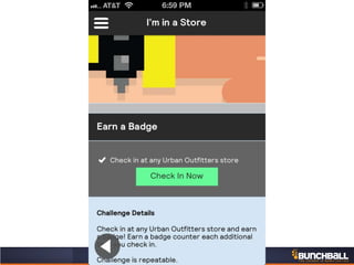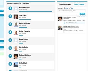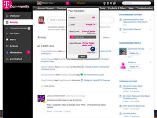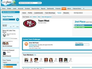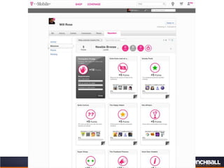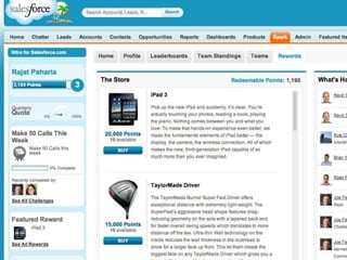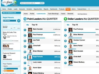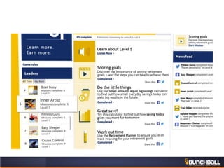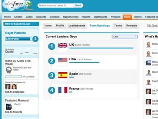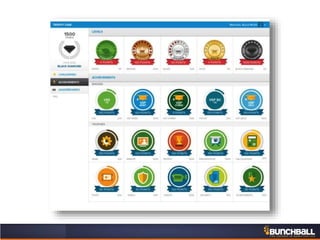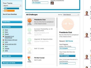 This document discusses key concepts related to motivating employee and customer behavior through gamification. It defines terms like actions, missions, points, badges, levels and leaderboards. It also outlines intrinsic and extrinsic motivators. Examples are provided of how gamification has been used to improve employee training, sales performance, customer service and loyalty at companies like LiveOps, Ford, T-Mobile and others. The results of these programs included increased engagement, improved performance metrics and better business outcomes.