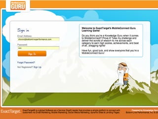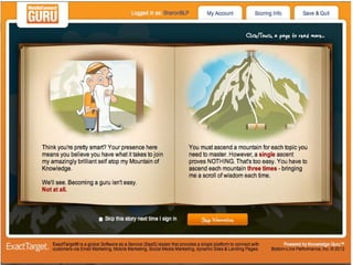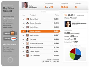 This document summarizes two case studies that used gamification to increase desired behaviors and learning outcomes. In the first case study, an insurance company used a gamified system to increase sales activity logging by over 250% and improve data in their salesforce system. The second case study discusses how a car company gamified an existing sales training program, which led to a 417% increase in site usage and exceeding the previous year's traffic volume within three months. Both cases illustrate how gamification can effectively promote learning and behavior change in organizational settings.