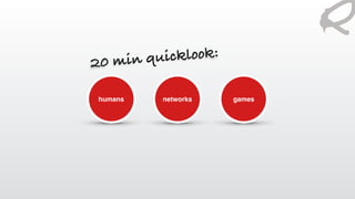 This document discusses gamification and its potential uses. It begins by providing statistics on digital device use and an overview of how digitalization is progressing. It then explores how social networks can promote the spread of ideas between groups. The document questions what the opposite of play is and provides a quote about using game design principles to improve reality. It lists elements like focus, team, rules, and progress that are important to games. Examples are given of companies using gamification for training and increasing deals. A model is presented that shows psychological needs met through gamification techniques. Contact information is provided for the author and his company.