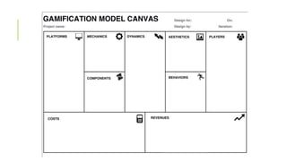 The document discusses the principles and frameworks of gamification design, emphasizing its role as a powerful toolkit for engaging users and promoting desired behaviors. It outlines a step-by-step approach to designing gamification solutions, including understanding business objectives, targeting behaviors, and implementing engaging activity cycles. Additionally, it warns against common pitfalls and stresses the importance of user data in effective gamification practices.