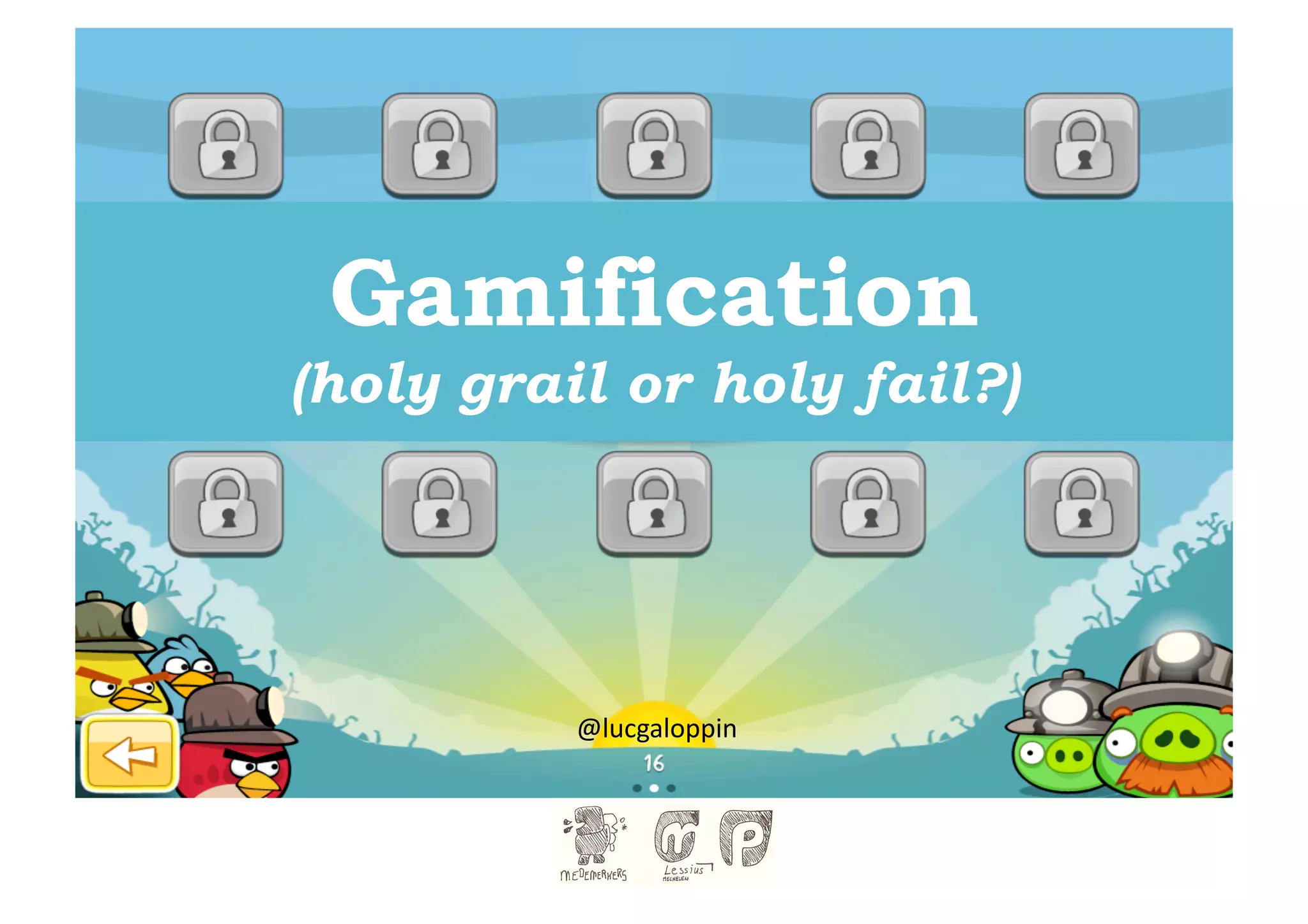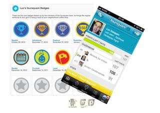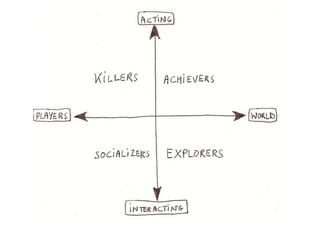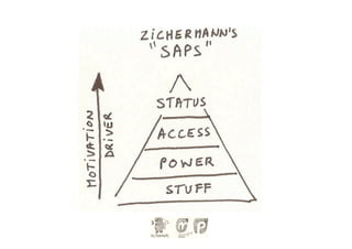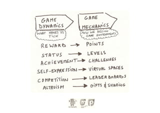 This document discusses gamification, which is the process of using game mechanics and game thinking to engage users and solve problems in non-game contexts such as work, education, and health. It provides an overview of key concepts in gamification including game dynamics, game mechanics, motivation, and choice architecture. It also summarizes perspectives on gamification from thought leaders like Jane McGonigal, Gabe Zichermann, and Seth Priebatsch. Resources on gamification like relevant presentations, websites, and experts are also referenced.