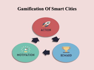 The document discusses the concept and applications of gamification within smart cities, highlighting how game-design elements can enhance civic engagement and improve services. It emphasizes the importance of citizen involvement in urban development and offers examples of successful gamification strategies in sectors like health, education, and environmental sustainability. Additionally, it describes various innovative initiatives aimed at increasing citizen interaction and motivation in urban settings.