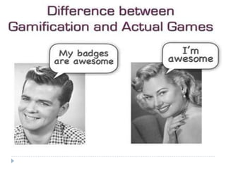 Gamification involves using game design elements in non-game contexts to motivate and engage users. It was invented in 2007 and gained popularity in 2010. Gamification applies psychological concepts like motivation, ability, and triggers to engage users. It also shares similarities with agile systems through iterative testing. Common game mechanics used in gamification include points, levels, leaderboards, badges, and challenges. Examples include fitness apps, customer loyalty programs, and social media platforms. Gamification can increase engagement and revenues but risks include ignoring product quality, overuse of points/badges, and not addressing underlying business issues.