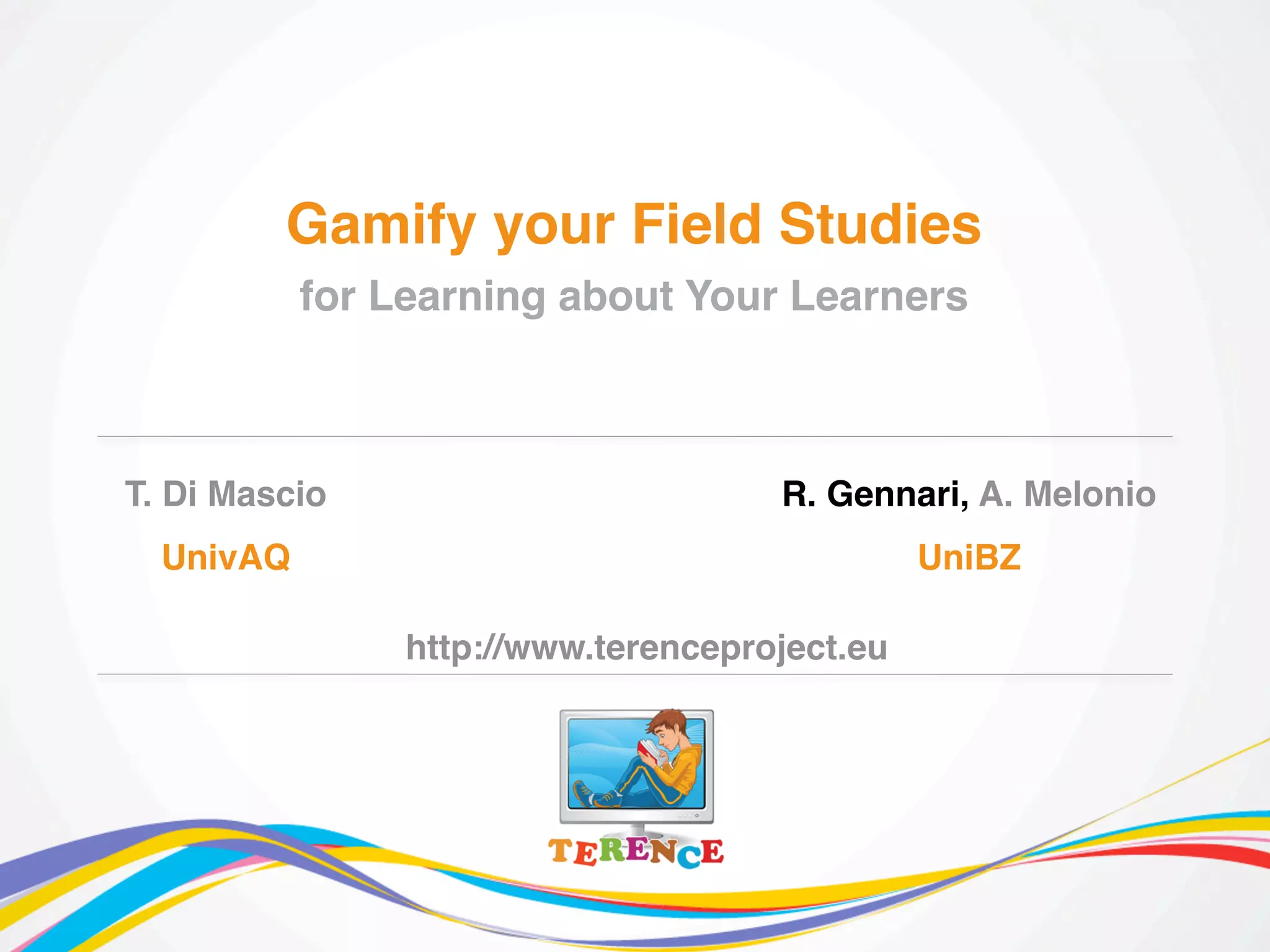 The document discusses gamifying field studies to collect data from children for a technology-enhanced learning (TEL) project called TERENCE. TERENCE aims to develop an adaptive learning system with digital books and games to help children with text comprehension difficulties. Field studies need to gather data from over 500 children and educators across Italy and the UK on how to design TERENCE's materials and system to be effective and usable. However, directly collecting data from children faces challenges regarding reliability, engagement, and school time constraints. The document proposes gamifying field studies to address these challenges and effectively inform TERENCE's design decisions based on its intended users' context of use.